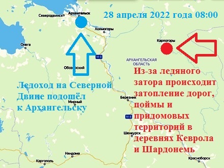 Согласно данным гидрологического бюллетеня от 28 апреля 2022 года на 08:00 по Москве, ледоход на Северной Двине подошёл к городу Архангельск. По данным на 08:00 мск по главному судовому ходу наблюдается густой ледоход. Лёд преимущественно мятый, битый, отмечается включение обширных полей.