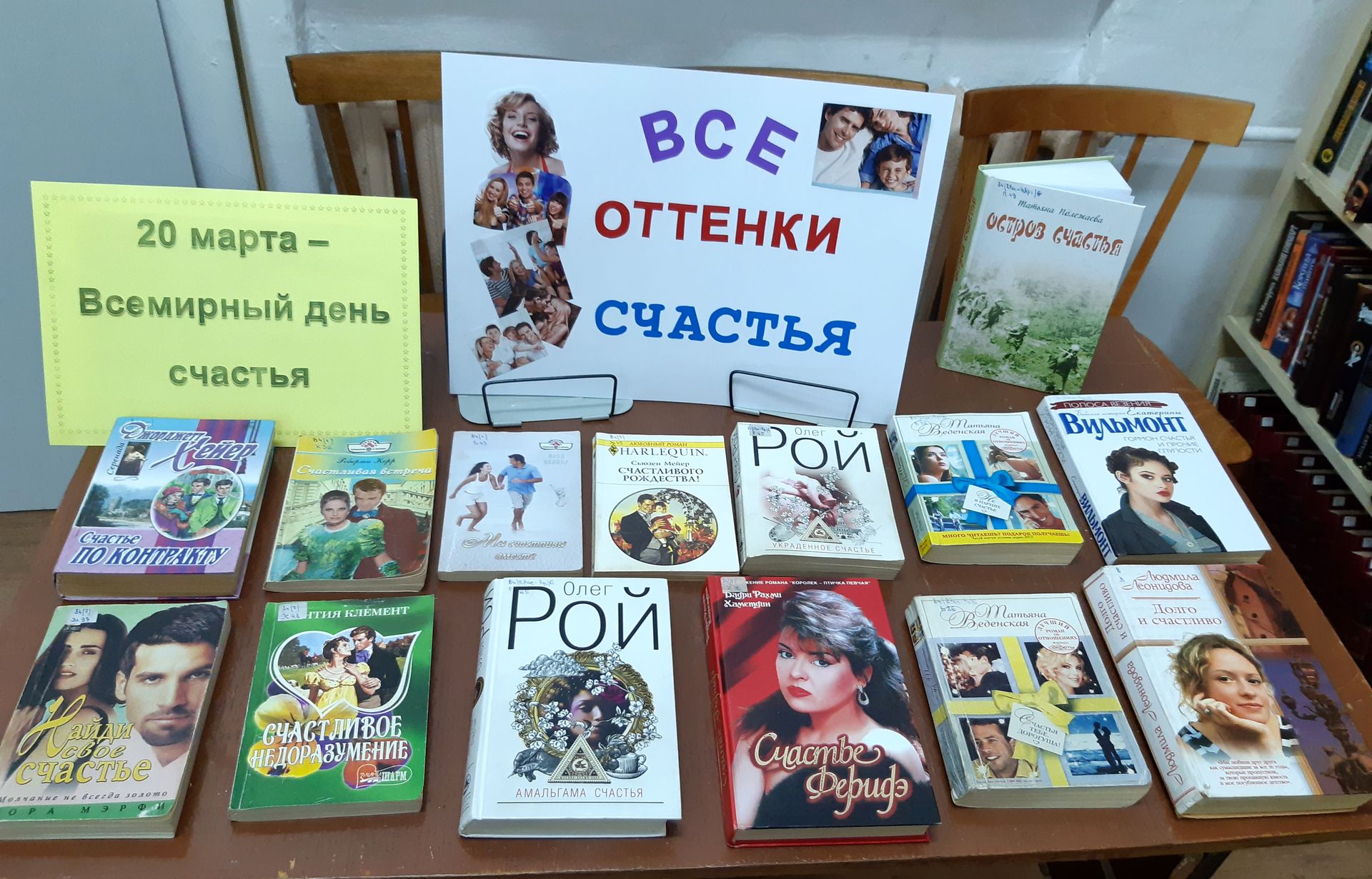 Всемирному дню счастья посвящена книжная выставка «Все оттенки счастья», развёрнутая в вычегодском филиале № 5. На ней представлены книги из фонда библиотеки-филиала, в названиях которых упоминается слово «счастье».
