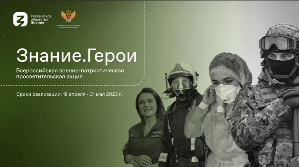 В соответствии с Указом Президента Российской Федерации от 21 июля 2020 г. № 474 «О национальных целях развития Российской Федерации на период до 2030 года» Общероссийская общественно-государственная просветительская организация «Российское общество «Знание» (далее – Российское общество «Знание») запускает Всероссийскую военно-патриотическую акцию Знание.Герои (далее – Акция), которая пройдет в период с 18 апреля по 31 мая 2023 года.