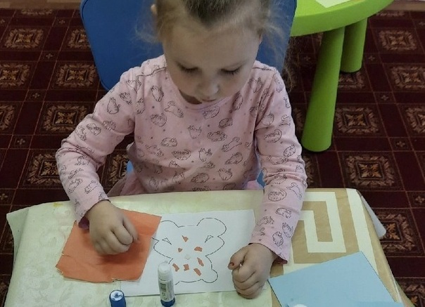 Довольные собой, юные артисты приступили к созданию Колобка в технике мозаичная аппликация. Дети с помощью небольших кусочков цветной бумаги выложили рисунок.