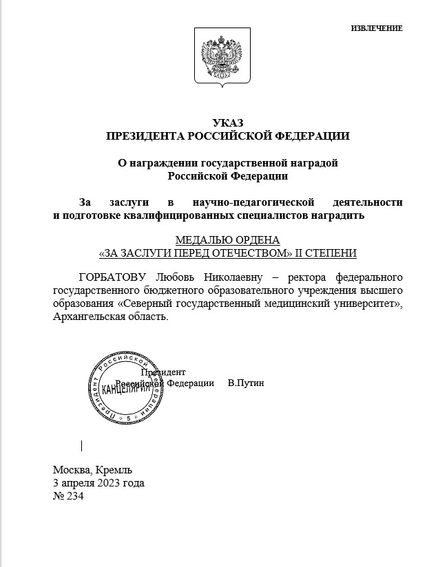 Президент России В.В.Путин подписал Указ о награждении медалью ордена «За заслуги перед Отечеством» II степени ректора СГМУ Л.Н.Горбатовой