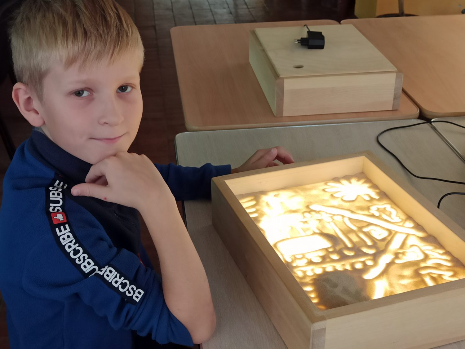 На занятии ребята познакомились с книгой Елены Борисовны Антроповой «Северный клубок», из которой можно узнать историю заселения берегов Белого моря, о знаменитых людях Архангельской области, о традициях быта и жизненного уклада поморов. Знакомясь с иллюстрациями книги, ребята создавали свои рисунки на песке: русскую печку, избу, северных животных, архитектурные памятники Архангельска и области.