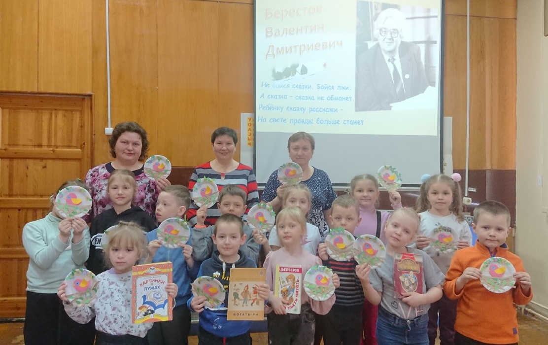 В библиотеке звучали стихи Валентина Берестова, ребята познакомились со сказкой «Честное гусеничное», посмотрели мультфильмы «Кошкин щенок», «Гололедица». В заключение для детей было организовано творческое занятие «Воробушки» по книге «Картинки в лужах». Ребята с огромным удовольствием делали пернатых!