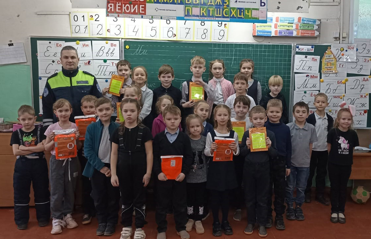 В ходе встречи с учащимися была проведена профилактическая беседа по правилам дорожного движения в зимний период о применении светоотражающих элементов на верхней одежде. Дети продемонстрировали очень хорошие знания правил дорожного движения, активно отвечали на вопросы. В конце встречи ученикам были подарены светоотражающие элементы, а классным руководителям светоотражающие жилеты, для использования их при организованных прогулках и экскурсиях, чтоб были дети заметны в пешеходном потоке для водителей.