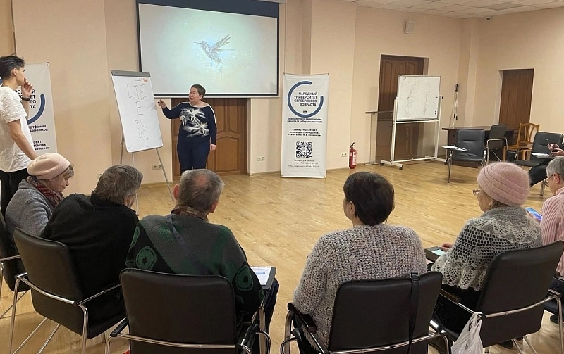 Очередное занятие для пожилых архангелогородцев состоялось на днях. Встречу провели председатель правления Ассоциации выпускников САФУ им. М.В. Ломоносова Елена Доценко и волонтер проекта, студент вуза Кирилл Харин.