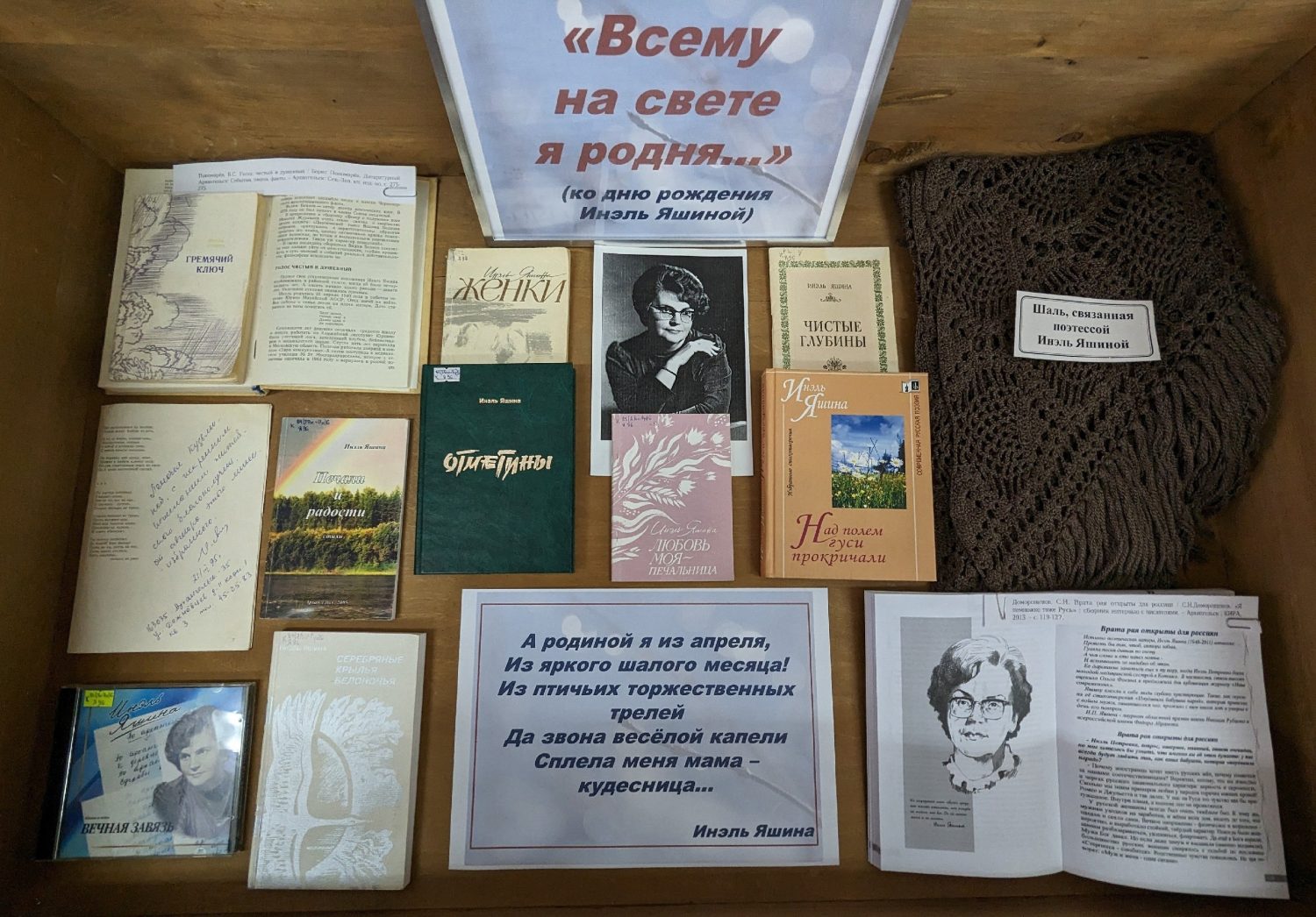 На выставке представлены сборники стихов Инэль Яшиной, среди которых есть и с автографом автора, статьи о её жизни и творчестве, интервью Сергея Доморощенова с ней из сборника «Я немножко тоже Русь». В фондах библиотеки-музея из личных вещей поэтессы хранится шаль, связанная её руками, она тоже присутствует в экспозиции.