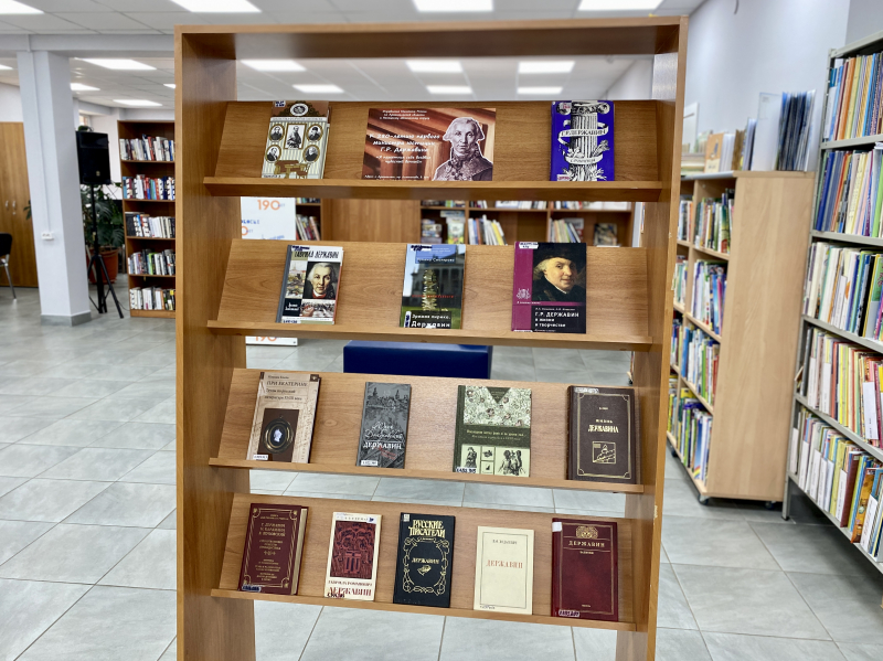 На экспозиции представлены книги из библиотечного фонда, посвященные жизни и творчеству Державина, его поэтические творения, проза, записки, публицистика и даже педагогические работы.