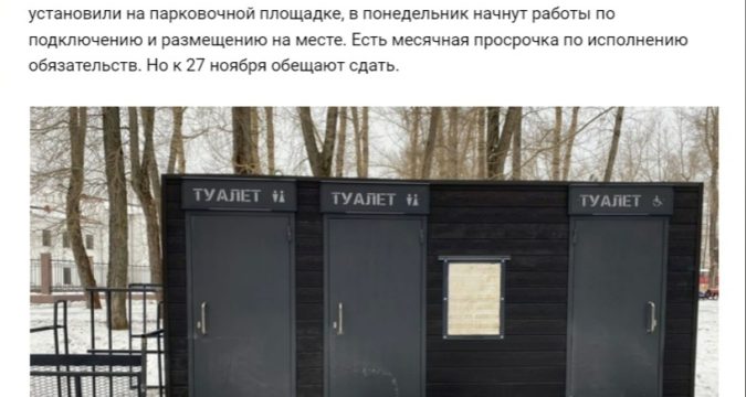 – Ура! Подрядчик привёз туалетный модуль в Петровский парк. Пока его временно установили на парковочной площадке, в понедельник начнут работы по подключению и размещению на месте. Есть месячная просрочка по исполнению обязательств. Но к 27 ноября обещают сдать – написал на странице в соцсети директор Архангельского областного Театра Драмы Сергей Самодов.