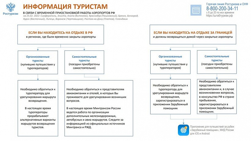 Ростуризм и ОНФ: +7-800-200-3411 (с 08:00 до 20:00 по московскому времени), сайт: штабтуризм.рф ; Минтранс России: +7 (499) 495-0009; РЖД: +7-800-775-0000; ситуационный центр (МИД России): +7(49) 695-4545. Подробнее с рекомендациями можно ознакомиться во вложении.