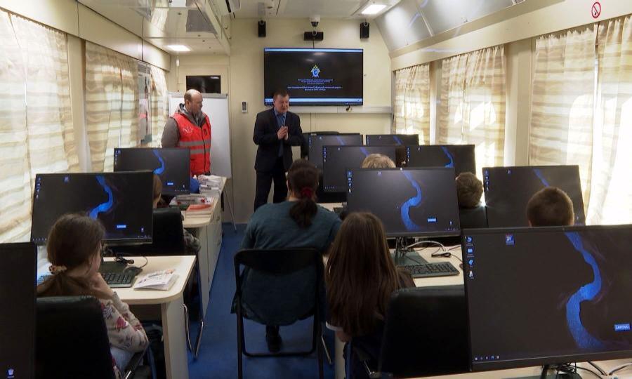В таком необычном учебном классе пятиклассники еще не были. Стулья, столы, компьютеры, но все это в поезде — в вагоне охраны труда. Пятиклассникам напоминают — шалости на путях могут стоить жизни. После — викторина. Кто даст больше правильных ответов?