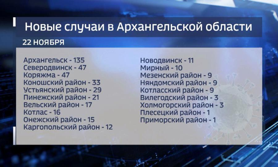Среди заболевших 135 жителей столицы Поморья, по 47 новых случаев — в Северодвинске и Коряжме, 33 — в Коношском районе, 29 — в Устьянском, 21- в Пинежском.