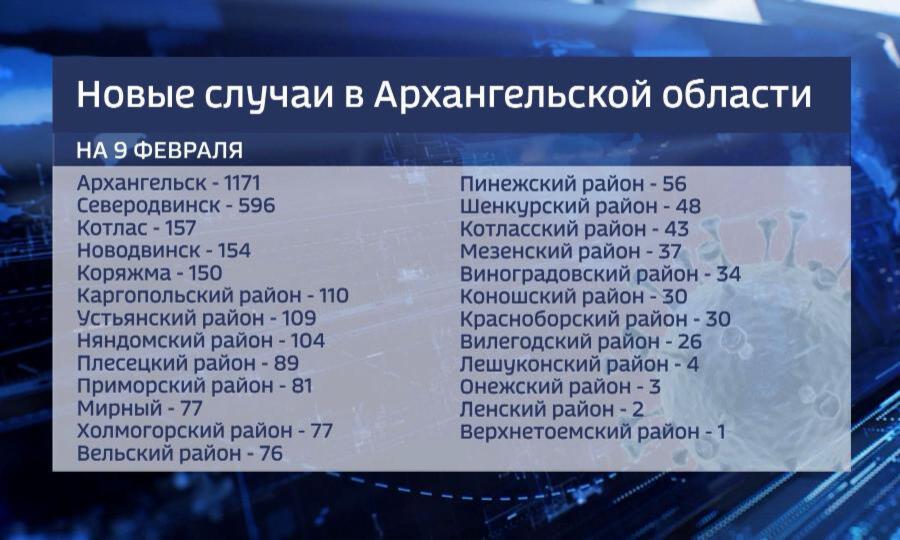 Среди новых заболевших 1171 архангелогородец, 596 северодвинцев, 157 жителей Котласа, 154 новых случая в Новодвинске, 150 — в Коряжме. Как сообщили в правительстве региона, в течение ближайших двух-трёх недель в регионе ожидается спад заболеваемости ковид-19. Есть и новшества.