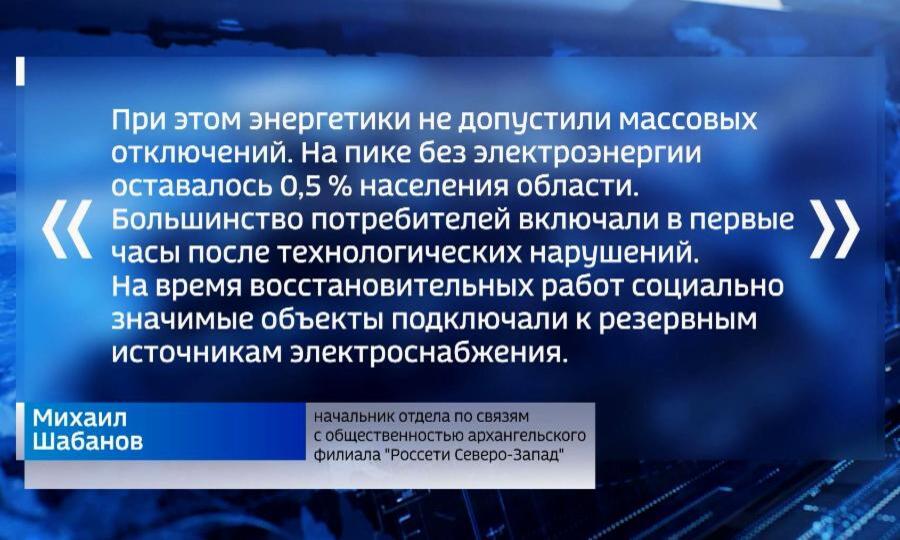 По словам начальника отдела по связям с общественностью архангельского филиала «Россети Северо-Запад», «информация о продолжительности отключений „неделями“ не соответствует действительности». Виной всех отключений стали сложные погодные условия. Мокрый снег и шквалистый ветер привели к сверхнормативных нагрузкам на линии электропередачи.