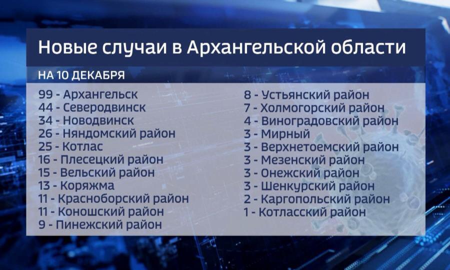 99 заболевших в Архангельске, вдвое меньше в Северодвинске — 44 случая, 34 — в Новодвинске, 26 — в Няндомском районе, 25 — в Котласе.