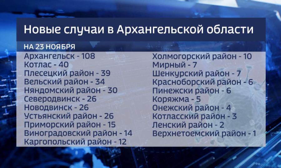 Среди новых заболевших — 108 архангелогородцев, 40 жителей Котласа, 39 новых случаев в Плесецком районе, 34 — в Вельском и 30 — в Няндомском.