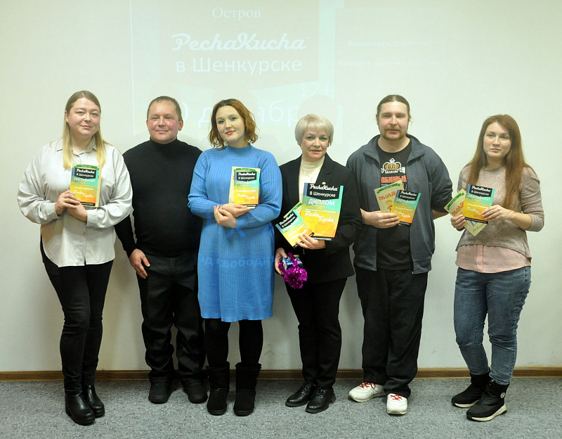 Участники шенкурской Печа-Кучи №17 (слева направо): Евгения Крюкова, ведущий Михаил Анфимов, Алёна Дранникова, Екатерина Купцова, Алексей Тепляков и Анастасия Козлова.