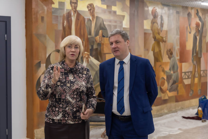 - Не только театр начинается с вешалки, культурный центр – тоже. В АГКЦ сейчас завершается капремонт зоны гардероба, арт- холла и хореографического зала на первом этаже, санузлов на нулевом. Большая удача, что сохранилось художественное панно советской эпохи. Его реставрация уже на финишной прямой – работают профессионалы! – сообщил Дмитрий Морев после рабочей поездки в культурный центр.