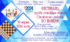 ПРИГЛАШАЕМ! В субботу 30 марта 2024 года состоится фестиваль "ШАШЕЧНЫЙ МАРАФОН" среди семейных команд по ШАШКАМ.