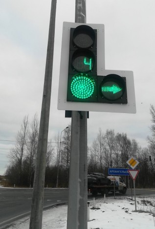 Введён в эксплуатацию новый светофорный объект с вызывным табло для пешеходов (кнопка вызова). Он установлен на примыкании улицы Окружной к федеральной автодороге М8 «Холмогоры».