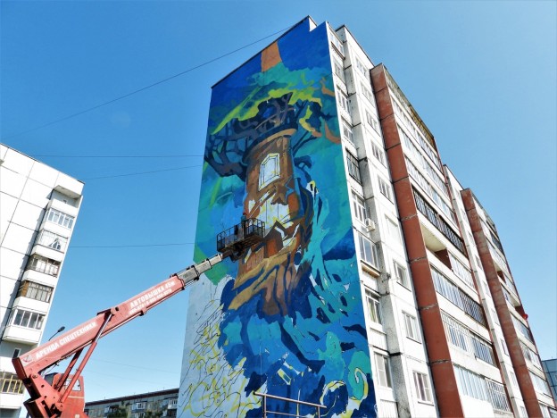 Это третья совместная работа «Сборной Тайболы» с Георгием Куриновым. Поморские мастера сотрудничали с краснодарским художником в работе над фасадом в Архангельске и двумя фасадами на Ямале.