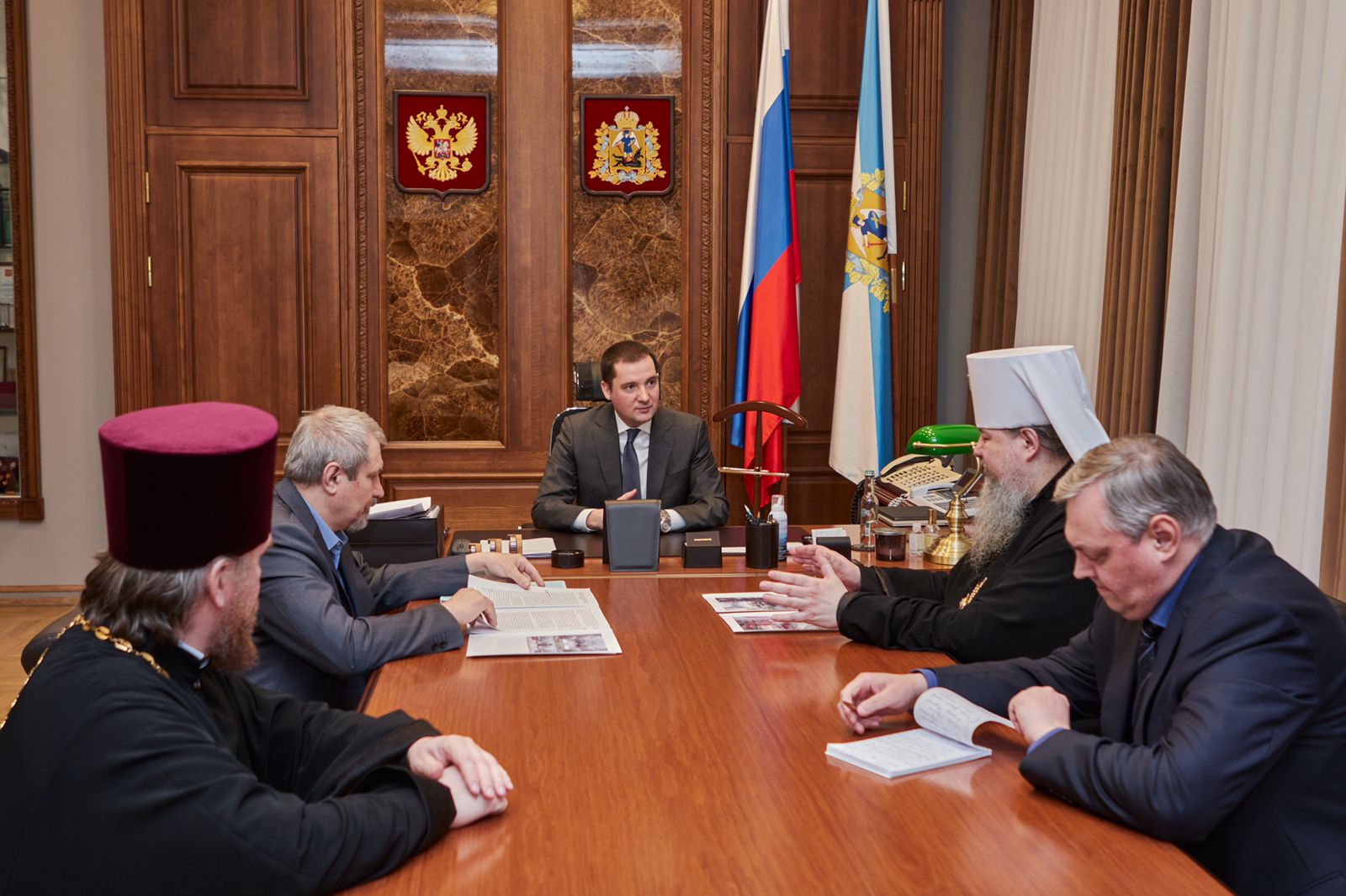 Митрополит Архангельский и Холмогорский Корнилий и губернатор Архангельской области Александр Цыбульский встретились в областном правительстве 12 апреля.