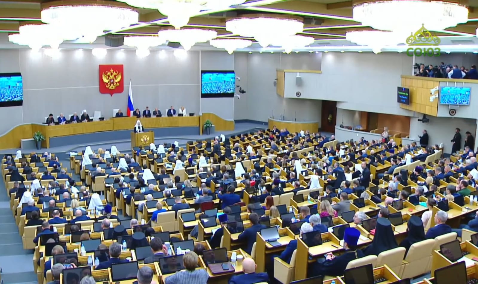 Святейший Патриарх Кирилл, В.В. Володин и митрополит Евгений прошли в зал заседаний Государственной Думы и заняли места в президиуме.