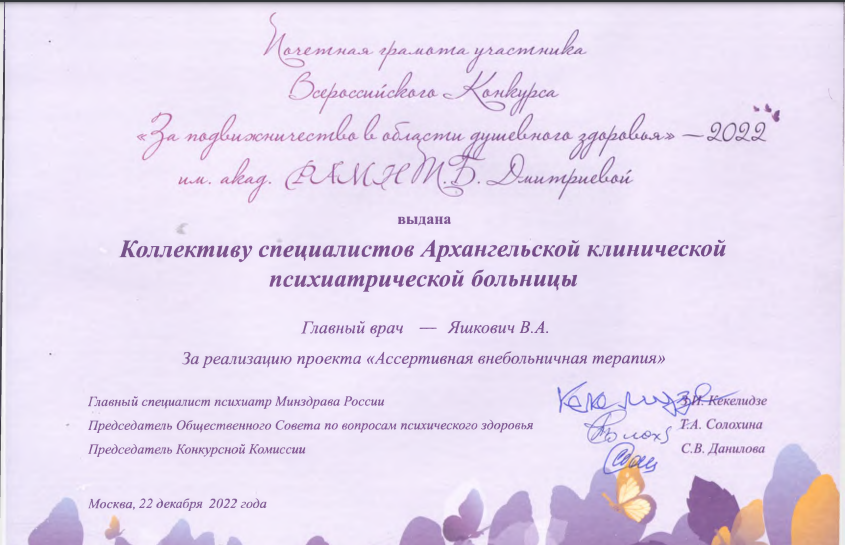 Коллектив отделения психиатрической помощи взрослым получил почетную грамоту за участие во всероссийском конкурсе “За подвижничество в области психиатрии”