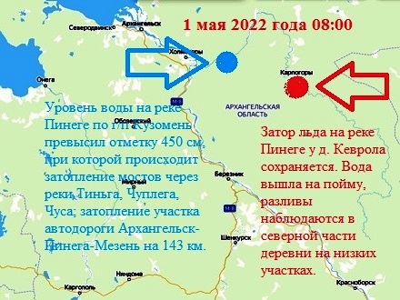 Согласно данным гидрологического бюллетеня от 1 мая 2022 года на 08:00 по Москве, по главному судовому ходу порта Архангельск отмечается средний ледоход. В Никольском рукаве у д. Рикасиха сохраняется ледяная перемычка. Выше по течению Северной Двины остаётся много льда в виде навалов на берегах и отмелях, с повышением уровня воды лёд снимается и на отдельных участках проходит в виде непродолжительного густого ледохода. В Косковском рукаве лёд стоит (50-45 км от г. Архангельск). Максимальный уровень воды по МГП-2 Соломбала утром 1 мая составил 222 см, по МГП-2 Смольный Буян – 248 см, по г/п Краснофлотский – 254 см.