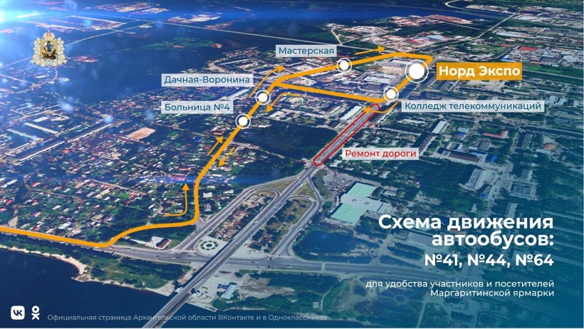 — Новая схема, которая будет действовать с 14 сентября до завершения работы Маргаритинской ярмарки, предполагает организацию движения автобусов со стороны центра города по улице Дачной, Окружному шоссе и далее по улицам Папанина, Воронина с возвращением через улицу Дачную на Ленинградский проспект, с остановками «Протезная мастерская» на Дачной, а также у «Норд Экспо» на улице Папанина. В обратном направлении автобусы будут двигаться по аналогичному маршруту, – рассказал заместитель министра транспорта Архангельской области Дмитрий Красавцев.