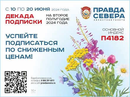 С 10 по 20 июня 2024 года проходит Всероссийская декада подписки, в ходе которой во всех отделениях Почты России и на сайте podpiska.pochta.ru можно будет оформить подписку на все печатные издания, в том числе на газету «Правда Севера», со значительной скидкой до 30%. Стоимость подписки на газету «Правда Севера», составляет 141,22 рубля в месяц.