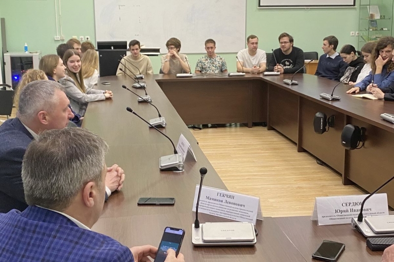 Члены Общественной палаты Архангельской области протоиерей Валерий Суворов, Юрий Сердюк, Мамикон Гекчан, Ольга Фофанова и Наталья Ожигина встретились со студентами в Северном Арктическом федеральном университете.