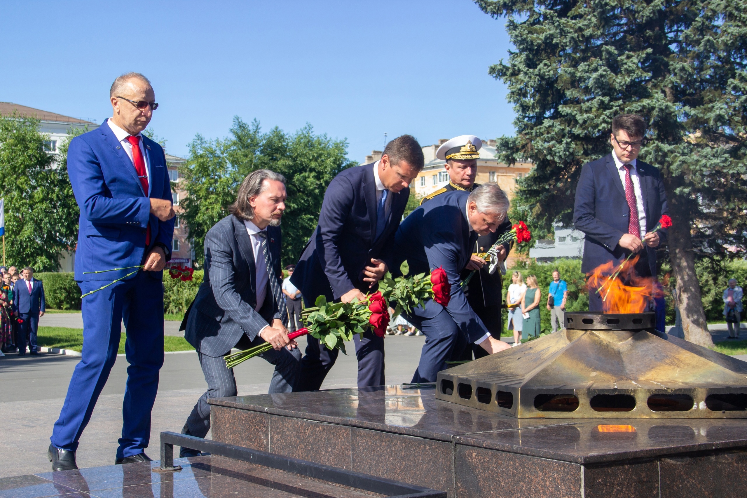 Сегодня в честь праздника в мемориальном комплексе на острове Ягры и в Северодвинске у Вечного огня, памятного знака «Ратному подвигу северодвинцев», состоялись торжественные церемонии возложения цветов.