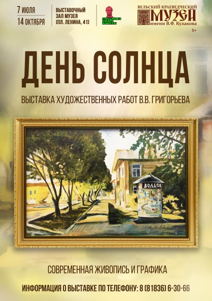 7 июля в 17:00 в выставочном зале Вельского краеведческого музея им. В.Ф. Кулакова состоится открытие выставки «День Солнца», которая познакомит с работами известного в Вельске художника Владимира Григорьева. Его картины участвовали в выставках Москвы, Санкт-Петербурга, Архангельска, Котласа, Вельска, Вологды и находятся в частных собраниях жителей многих стран: Китая, США, Австрии, Швеции и многих городов России.