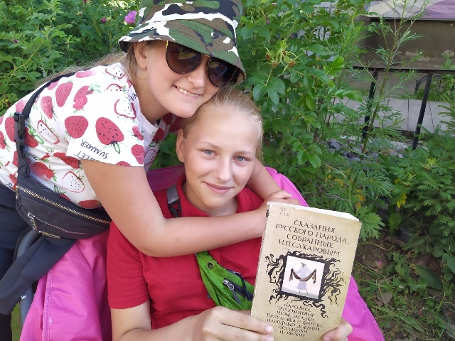 Ребята микрорайона Бакарица собрались в библиотечном дворике, уютно разместившись на креслах-шезлонгах и крылечке. Библиотекари провели обзор книг по фольклору, прочитали русские народные сказки.