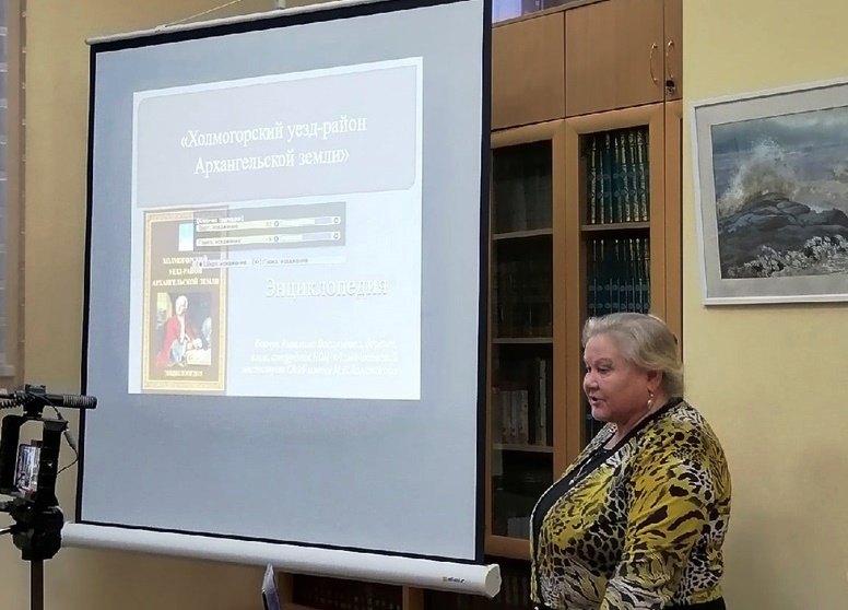 В Центральной городской библиотеке им. М.В. Ломоносова в рамках Малых Ломоносовских чтений состоялась презентация энциклопедии «Холмогорский уезд-район Архангельской земли», которую представила Ангелина Васильевна Борчук, доцент, кандидат педагогических наук, сотрудник НОЦ «Ломоносовский институт» САФУ им. М.В. Ломоносова.