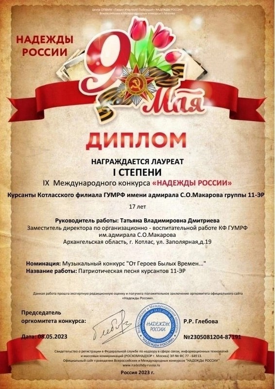 Курсанты группы 11-ЭР Котласского филиала ГУМРФ имени адмирала С.О. Макарова (классный руководитель Дмитриева Татьяна Владимировна) стали лауреатами 1 степени в IX Международном конкурсе "Надежды России" в номинации "Музыкальный конкурс "От Героев Былых Времен..."