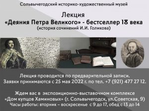 В фондах Сольвычегодского историко-художественного музея хранится уникальное собрание сочинений И. И. Голикова «Деяния Петра Великого» (1782-1787 гг.