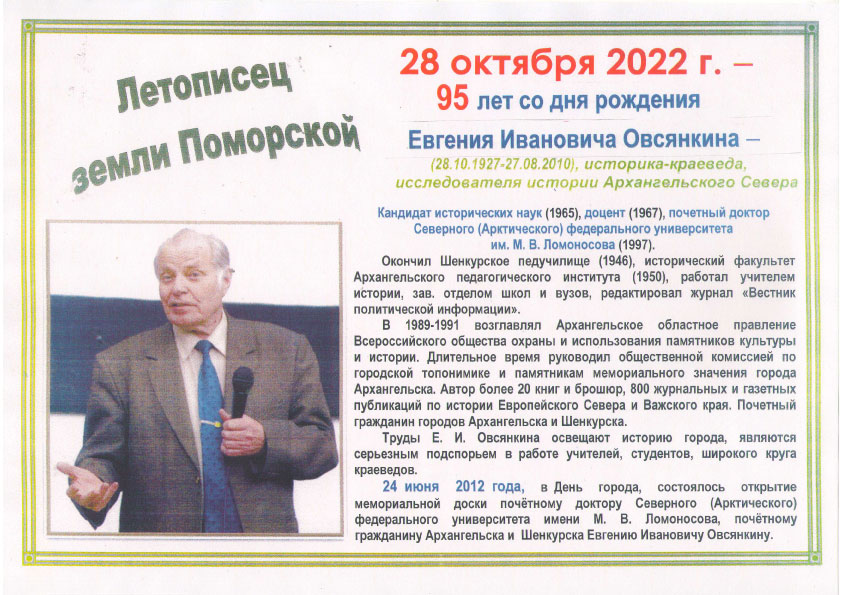 В Архангельске и области 28 октября проходят памятные мероприятия, посвящённые 95-летию со дня рождения известного архангельского историка, исследователя, регионоведа Евгения Ивановича Овсянкина.