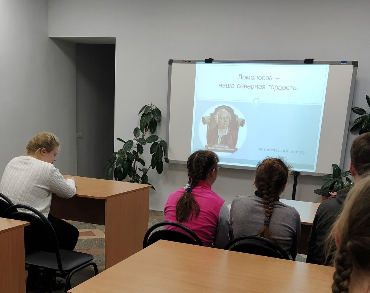 11 ноября в библиотеке–филиале № 8 для старших классов школы № 14 прошёл урок истории «Ломоносов — наша северная гордость».