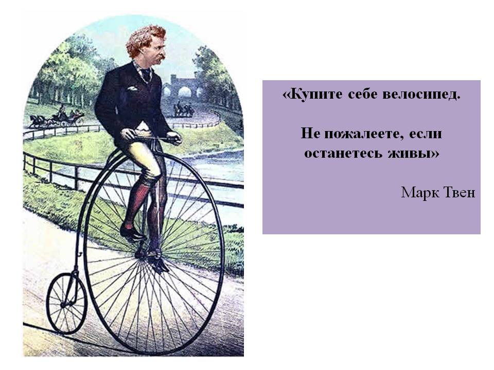 А еще сто лет назад велосипед был немного другой формы. Рассказ Марка Твена «Укрощение велосипеда» посвящен пенни-фартинг – именно так тогда назывался велосипед.
