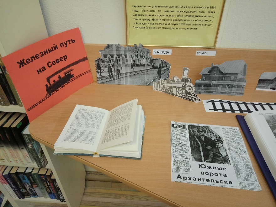 В Исакогорской библиотеке № 12 оформлена выставка-экспозиция «Железный путь на Север», посвященная 125-летию железной дороги между Вологдой и Архангельском.