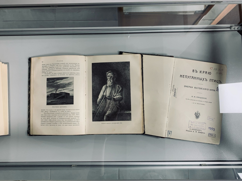 Однако его наследие этим далеко не ограничивается. Он начинал свою карьеру как автор этнографических и путевых очерков. Многие годы писатель путешествовал по стране. Несколько раз бывал и на Русском Севере, который стал источником его вдохновения в самом начале творческого пути, когда он отправился по совету этнографа Николая Ончукова в карельские леса. По итогам этой поездки начинающий литератор выпустил свою первую книгу – «В краю непуганых птиц. Очерки Выговского края». Она была издана в 1907 году в петербургском издательстве выходца из Швейцарии А. Ф. Девриена. Кстати, в книгу были включены 66 рисунков по снимкам Пришвина и его знакомого П. П. Ползунова с натуры. Два экземпляра этого издания сохранились в фонде Добролюбовки. Книгу могут полистать все желающие в Электронной краеведческой библиотеке «Русский Север» .