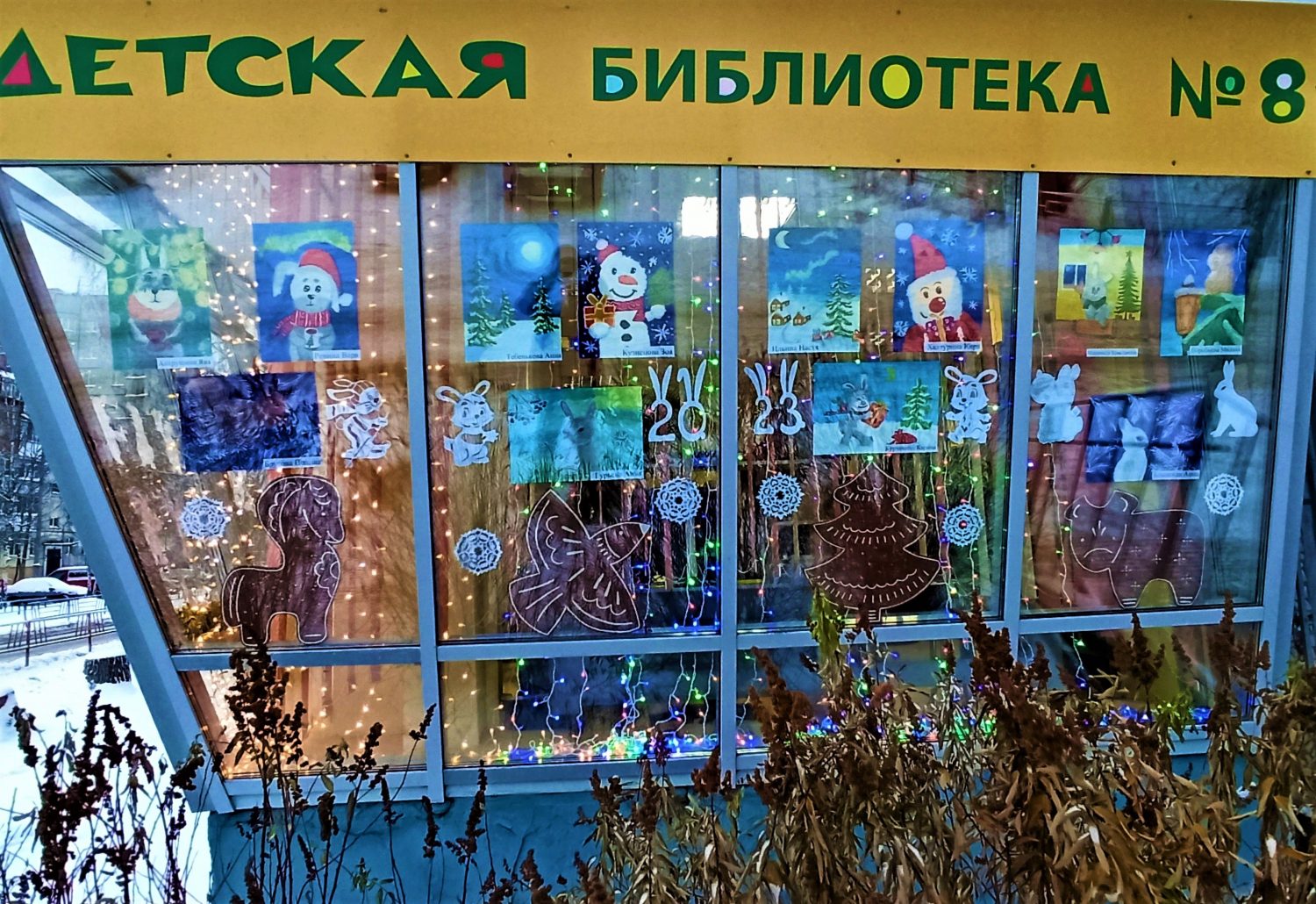 Традиционно окна библиотеки украшают рисунки детей, учащихся в «Студии живописи и художественного дизайна» МБУ ДО «СДДТ» на базе МБОУ СШ № 20.