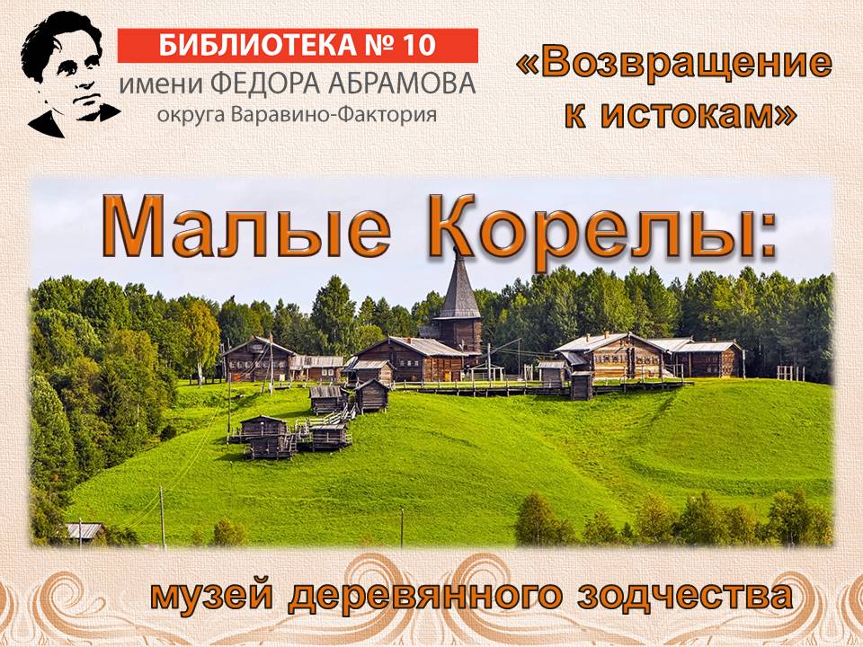 Библиотека №10 имени Фёдора Абрамова округа Варавино-Фактория представляет видеопрезентацию, посвященную году культурного наследия народов России. Речь пойдет об одном из памятников под открытым небом. Это музей деревянного зодчества – Малые Корелы, одна из крупнейших ландшафтных экспозиций в России. «Памятники культуры – это генераторы духовной энергии, вложенной в них теми людьми, которые их создавали, а также теми людьми, которые на протяжении многих веков им поклонялись. Разрушая памятники культуры, мы разрушаем самое ценное – духовную энергию народа», писал Федор Абрамов.