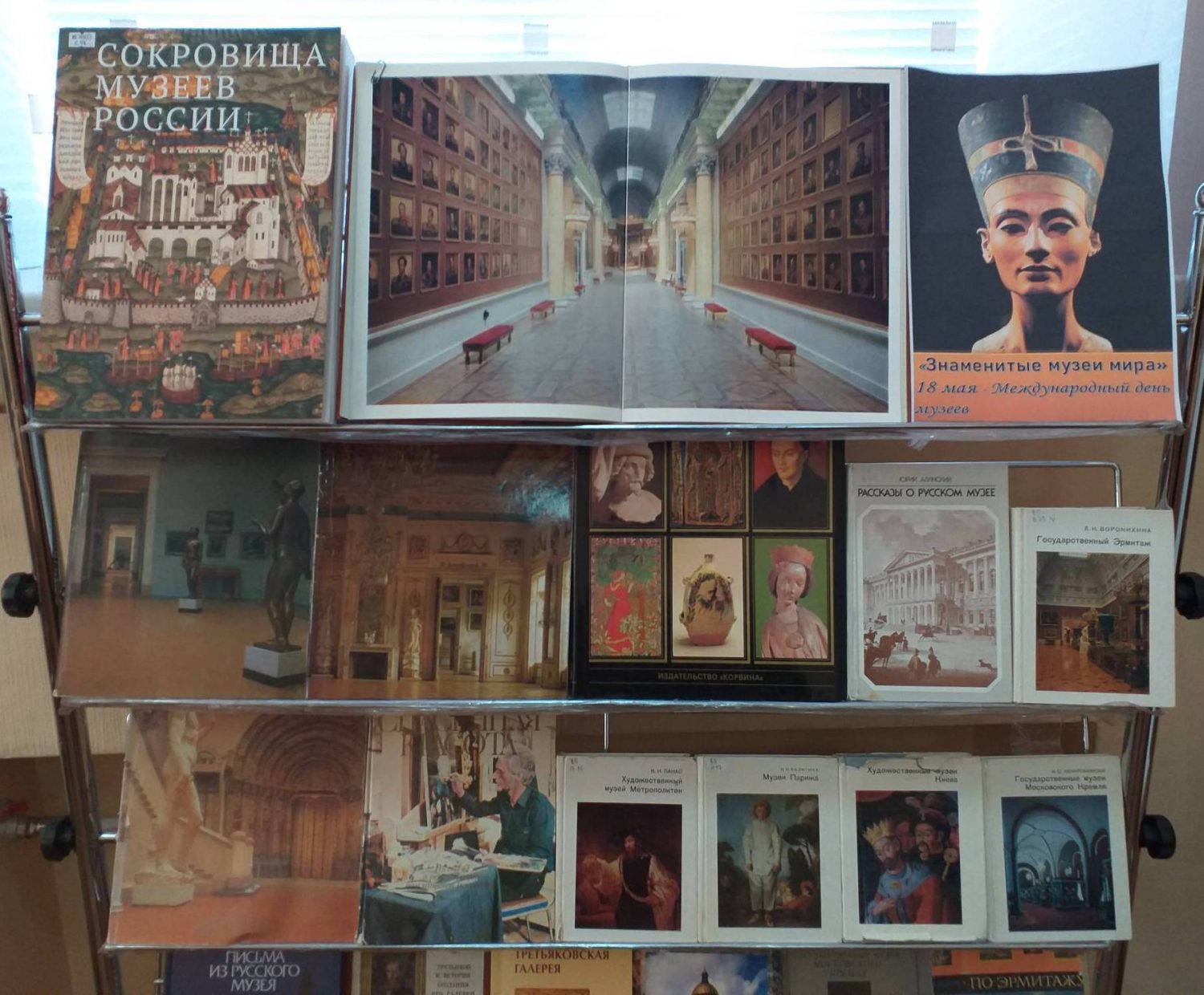 На выставке представлена литература о разных известных музеях мира. Книга Л.Н. Воронихиной «Государственный Эрмитаж» рассчитана на широкий круг читателей, которым интересна архитектура музейных зданий Эрмитажа. Книга К.И. Парнаса «Художественный музей Метрополитен» познакомит читателя с самым большим художественным музеем США, входящим также в число наиболее выдающихся художественных музеев мира. Книга Н.Н. Калитиной «Музеи Парижа» является своеобразным рассказом-очерком, в котором автор повествует о чудесных памятниках мирового искусства, хранящихся в богатых собраниях столицы Франции.