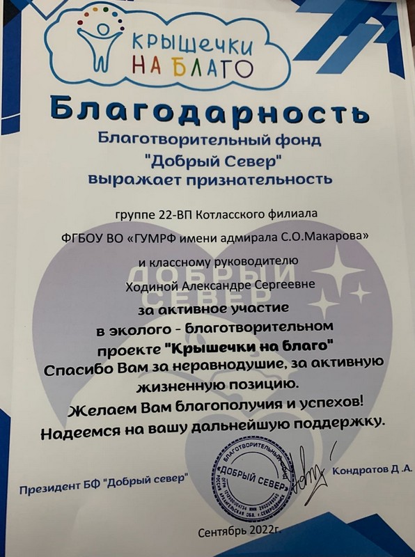 Награждение благодарственным письмом фонда «Добрый север» за активное участие в экологическом и благотворительном проекте «Крышечки во благо» стало для курсантов приятной неожиданностью. Молодцы!
