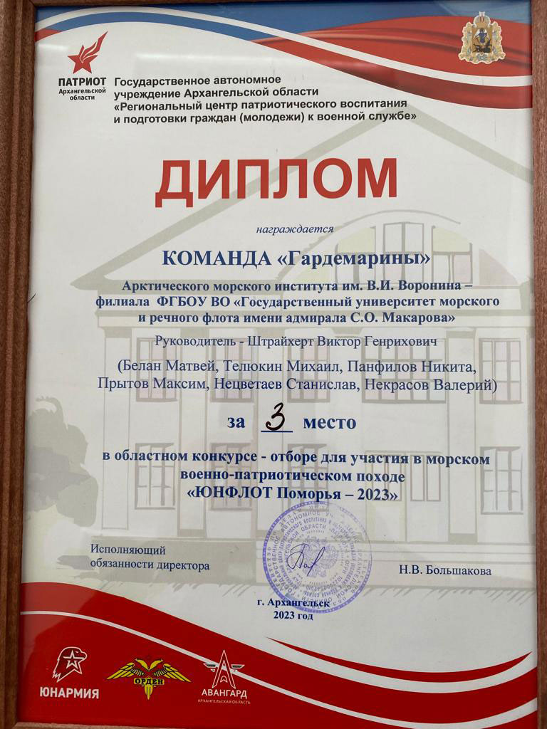 Команда «Гардемарины» Арктического морского института имени В.И.Воронина под руководством преподавателя – организатора основ безопасности жизнедеятельности Виктора Генриховича Штрайхерта в упорной борьбе завоевала 3 место и право стать участником морского похода Архангельск - Соловецкие острова на гидрографическом судне «Сенеж».