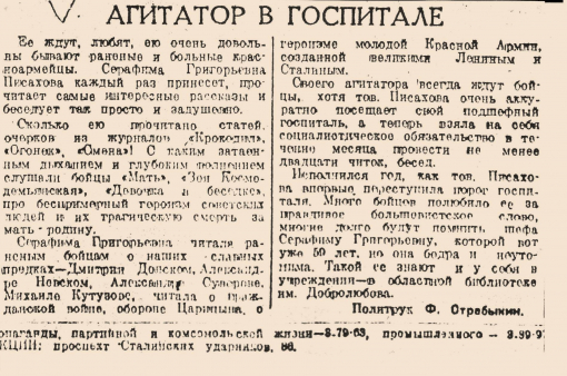 Приказом директора библиотеки Серафиме Григорьевне была объявлена благодарность с занесением в личное дело за общественно-политическую работу среди населения и среди бойцов подшефного госпиталя.