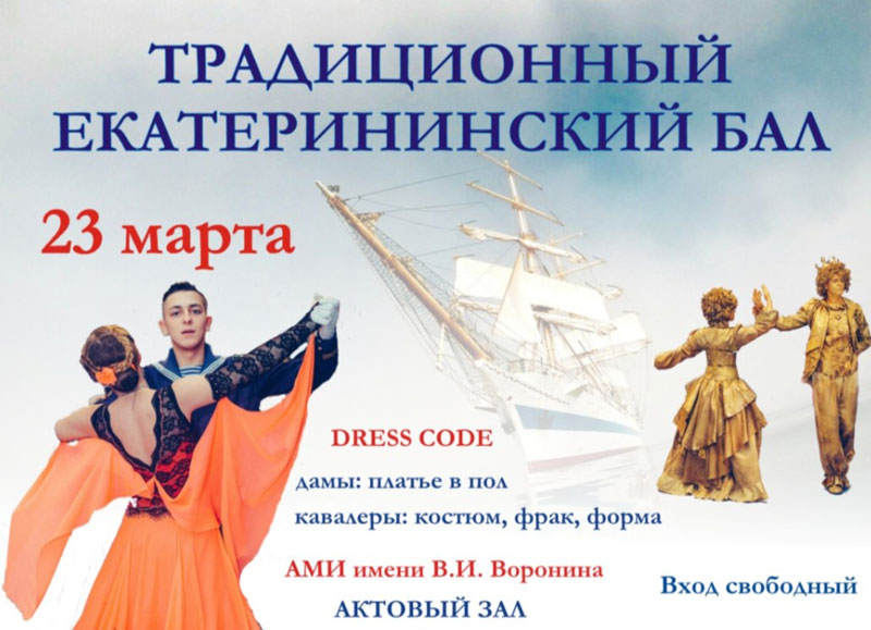 23 марта в 16 часов в Арктическом морском институте имени В.И. Воронина состоится Екатерининский бал. Праздник музыки и танца посвящается императрице Екатерине Великой, которая 243 года назад, в марте 1781 года, подписала указ об открытии мореходной школы в Холмогорах, правопреемником которой стал Арктический морской институт.