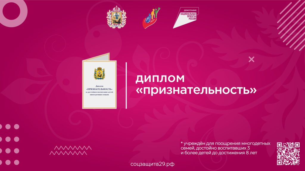 Министерство труда, занятости и социального развития Архангельской области напоминает, что право на поощрение дипломом «Признательность» у многодетных семей возникает при условии достижения детьми восьмилетнего возраста, а также по истечении одного года со дня принятия ребенка на воспитание в приемную семью.